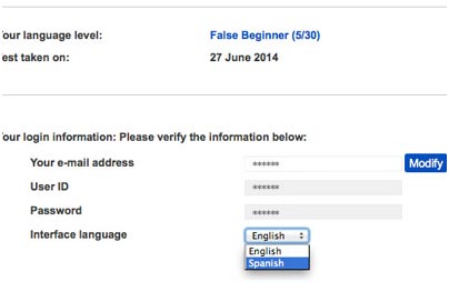 Si vous vous êtes trompé de langue lors de votre commande, ou si vous souhaitez changer votre niveau, contactez-nous via le formulaire. Pour changer la langue d'interface de l'outil, cliquez sur "Mon compte" puis changez la langue comme indiqué sur l'image ci-dessous.